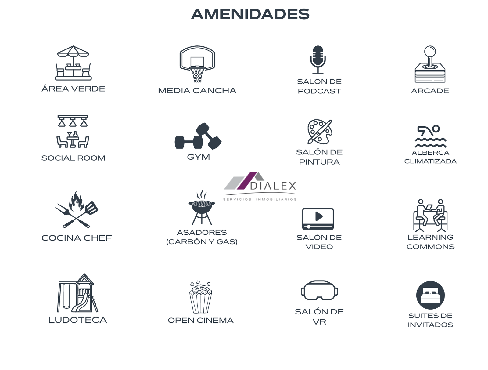 Área verde, Social room, Cocina chef, Ludoteca, Media cancha, Gym, Asadores (carbón y gas), Open cinema, Salón de podcast, Salón de pintura, Salón de video, Salón de VR, Arcade, Alberca climatizada, Learning commons y Suites de invitado.