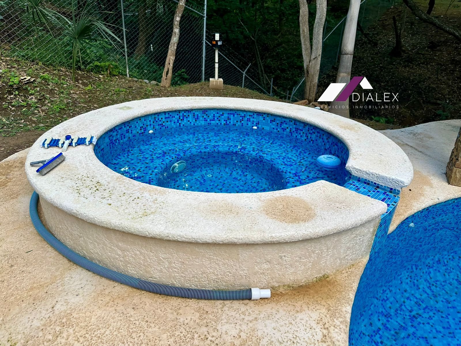 Dispone de 2 recámaras y 2 baños, además de área social exterior con alberca y jacuzzi en funcionamiento, ambos recubiertos completamente con mosaico veneciano. Incluye bar y baños públicos independientes, lo que la vuelve perfecta para reuniones y eventos.